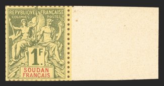 519 og Yvert #2 ImageYvert #2, 1894 "SOUDAN Fais/0,25" Surcharge on 1Fr. Bronze green on straw, a highly desirable example of this often faulty mint stamp, well centered, especially when compared to the others, as these typically come quite off center, unusually fresh with luxuriant color, o.g., l.h., very fine; while 950 stamps were surcharged most were used and lost to philately, leaving scant few mint examples available, of which the example offered here is among the finest; signed Champion (Scott #2; $4,750.00). (Image) €5,300