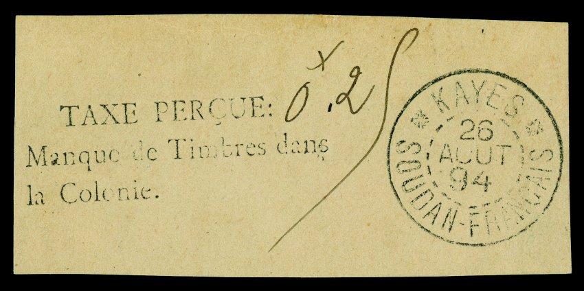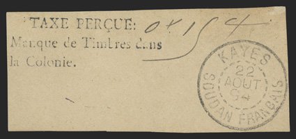 521 p   Image1894 "0.15" and "0.25" Manuscript rate and "TAXE PERCUE:/Manque de Timbres dans/la Colonie" cachet on separate pieces with August 1894 Kayes datestamps, very fine and scarce; this provisional cachet was only used for a brief period during a shortage of postage stamps; each signed Bernichon and Roumet and accompanied by 2007 Roumet certificate. (imagea) (Image) Est. $200-300