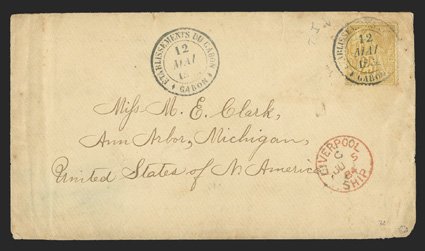 523 c   ImageFrench Colonies #53, 1881 25c Yellow on straw, tied to cover to Ann Arbor, Michigan by large double circle "Etablisshments du Gabon, Gabon/12 MAI, 1884" datestamp, postmark repeated at left, red "Liverpool/Ship/JU 5, 84" transit and "New York/JUN 15/Paid All" transit backstamp, cover with slight aging, otherwise a very fine and scarce usage using British mails; signed Roumet (Scott #53). (Image) Est. $300-400