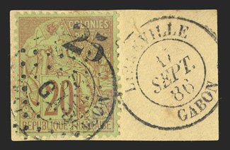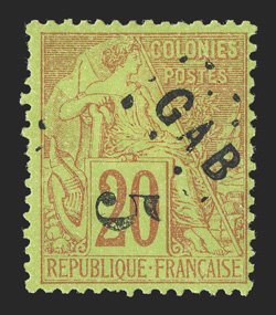525 p Yvert #3A ImageYvert #3A, 1886 "GAB/25" Surcharge with 56-dot diamond grid around "GAB" on 20c Red on green, incredibly well centered example of this rare stamp, tied to piece by two strikes of "Libreville, Gabon/17 SEPT, 86" datestamps, rich colors on fresh paper, extremely fine; only 50 stamps received this surcharge; signed Bernichon and Roumet and accompanied by 2002 Roumet certificate (Scott #3e; $1,900.00). (Image) €2,100