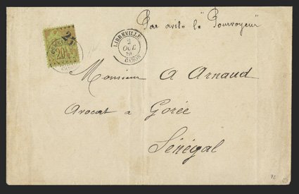 526 c Yvert #3A ImageYvert #3A, 1886 "GAB/25" Surcharge with 56-dot diamond grid around "GAB" on 20c Red on green, single with strong fresh colors tied by "Libreville, Gabon/2 OCT 86" datestamp to cover to Goree, Senegal, postmark repeated to right, "Pour aviso le Gourvoyeur" directive, Dakar and Senegal backstamps, cover with vertical pocket fold at center, very fine; a great rarity, especially used on cover, as only 50 stamps were surcharged; signed Behr and Roumet and accompanied by 2007 Roumet certificate (Scott #3e; $10,000.00). (Image) Maury €8,250