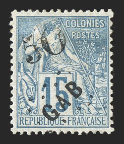 527 og Yvert #4 ImageYvert #4, 1886 "GAB/50" Surcharge on 15c Blue, select mint example of this scarce stamp, wonderfully fresh, nicely centered, o.g., trivial h.r., very fine; only 300 stamps were surcharged; signed A. Brun and Calves and accompanied by 1987 J. Robineau certificate (Scott #4; $1,450.00). (Image) €1,700