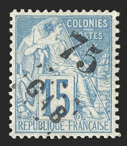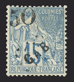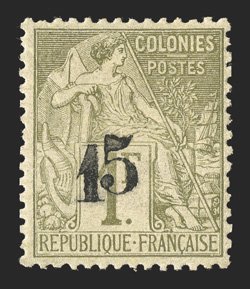 531 og Yvert #6 ImageYvert #6, 1888-89 "15" Surcharge on 10c Black on lavender, a particularly fresh and choice example of this surprisingly rare mint stamp, rich colors and crisp impression, nicely centered, o.g., small h.r., very fine; while 800 stamps were surcharged nearly all were used as postage; signed A. Brun, Calves and Roumet and accompanied by 1999 Roumet certificate; ex-Gilbert (Scott #6; $5,600.00). (Image) €6,850