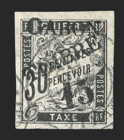 538 O Yvert #12 ImageYvert #12, 1889 "GABON" and "TIMBRE" Overprints and "15" surcharge on 30c Black postage due, an especially choice used example of this rare stamp, featuring uncommonly large margins all around, rich color on fresh white paper, lightly cancelled, extremely fine; only 250 stamps were surcharged; signed Calves and Miro twice (Scott #12; $3,700.00). (Image) €4,400