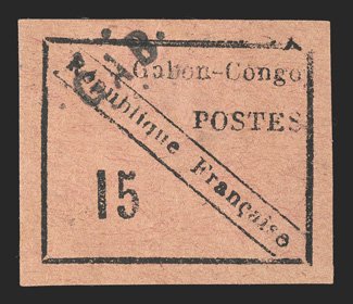 537 og Maury #11c ImageMaury #11c, 1889 "GABON" and "TIMBRE" Overprints and "15" surcharge on 5c Black postage due, double "GABON", top left corner margin single, with large margins on the other sides, o.g., small h.r., extremely fine; signed Roumet. (Image) €1,000