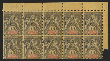 581 og/nhbl Yvert #49b, 49c, 49e ImageYvert #49b, 49c, 49e, 1903 "G & D/1 fr." Ty. q and r Surcharges on 75c Deep violet on orange, wonderfully fresh top right corner margin mint block of ten (5x2), the bottom right stamp with Ty. r surcharge with numeral "1" inverted, the other nine all Ty. q, the center vertical pair also showing inverted numerals, fresh and intact, o.g., l.h., top left and bottom stamps all n.h., very fine and striking (Scott #49, 49b, 49b var.; $1,157.50+). (Image) Maury €1,381+