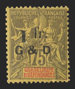 582 og Yvert #49g var. ImageYvert #49g var., 1903 "1 fr./G & D" Surcharge with value above "G & D" on 75c Deep violet on orange, "1" inverted, quite fresh, o.g., l.h., fine; this combination of errors is not listed in Yvert; cataloged as the normal #49g (Scott #49c; $300.00+). (Image) €350+