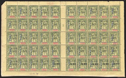 583 og/nhbl Yvert #50g, 50h, 50i ImageYvert #50g, 50h, 50i, 1904 "G et D/40" Ty. m and n surcharges and blue framed "1903" Ty. aa, bb and cc overprints on 1Fr. Bronze green and straw, complete pane of 50, with vertical gutter containing millesimes "3", the six lower right stamps with Ty. n surcharge and the rest Ty. m, while the "1903" overprint shows fourteen Ty. aa, 35 Ty. bb and one Ty. cc at top left, o.g., most n.h., some perf. separations and hinge reinforcements, very fine; a rare and desirable multiple for the specialist (Scott #52 var.). (Image) for hinged €4,335+