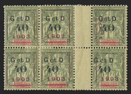 584 og/nhbl Yvert #52h, 52n ImageYvert #52h, 52n, 1904 "G et D/40" Surcharge and red framed "1903" Ty. ee and ll overprints on 1Fr. Bronze green and straw, gutter block of six (3x2), the top right stamp with Ty. ll overprint and the other five Ty. ee, nicely centered, o.g., h.r., the right pair n.h., rejoined perf. separated at the left side of the gutter, fine-very fine (Scott #50 vars.). (Image) for hinged €880