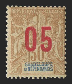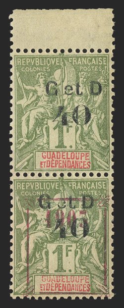 585 og Yvert #52t ImageYvert #52t, 1903 "G et D/40" Surcharge and red framed "1903" overprint on 1Fr. Bronze green and straw, omitted overprint, top sheet-margin vertical pair, the top stamp with the red "1903" overprint omitted, excellent centering, strong and intact perforations, o.g., l.h., extremely fine and very rare; only ten such error pairs are possible; signed Roumet and accompanied by his 2006 certificate (Scott #50 var.). (Image) €2,200