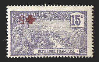 592 og Maury #76c, 76e ImageMaury #76c, 76e, 1915-17 "+5c" Surcharge on 15c Violet, double and inverted surcharges, o.g., h.r., fresh and fine (Scott #B2a, B2c; $465.00). (Image) €575