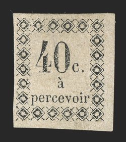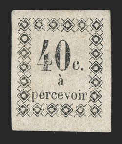 594 ng Yvert #TT3 ImageYvert #TT3, 1876 40c Black, unused as most often, four large to very large margins, strong color on fresh paper, very fine and choice; signed Bloch (Scott #J3; $1,500.00). (Image) €1,800