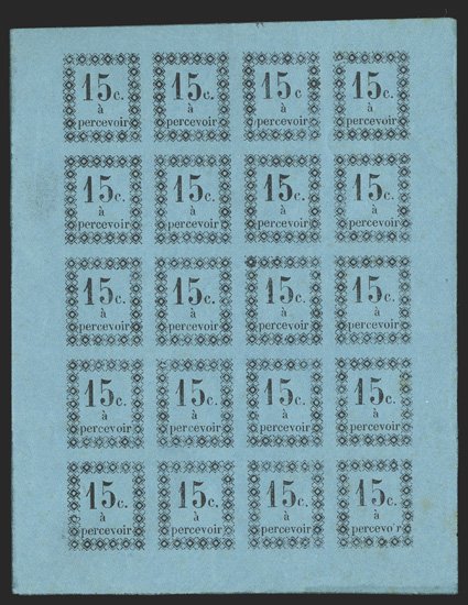 597 ogbl Yvert #TT4a, 4b ImageYvert #TT4a, 4b, 1879 15c Black on dark blue, a remarkable full mint pane of twenty from the third setting (fourth printing), pos. 3 with no period after "c" (#TT4b) and pos. 20 with "i" missing in "percevoir" (Maury #TT4c) large even margins all around, deep rich color, vertical stitch watermark, original gum, small natural paper flaw and a couple minor faults in the selvage only, extremely fine appearance; 2004 Roumet certificate (Scott #J4, J4a, J4c; $1,365.00 for singles). (Image) for singles €1,930+