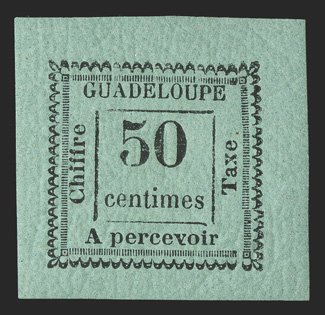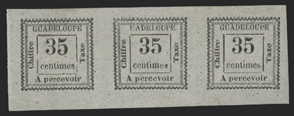 599 og Yvert #TT11, 11a ImageYvert #TT11, 11a, 1884 35c Black on grey, "G" missing in "GUADELOUPE", horizontal strip of three, the center stamp the error, huge margins all around, original gum, extremely fine; only 400 copies of this error were printed; signed E. Diena (Scott #J11 var.). (Image) for singles €450