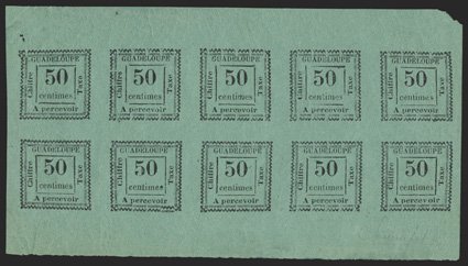 601 og/nhbl Yvert #TT12a ImageYvert #TT12a, 1884 50c Black on blue-green, a spectacular mint full pane of ten from the second setting, remarkably fresh, wide sheet-selvages, full original gum, most stamps never hinged, extremely fine; only 108 stamps were printed on this paper, with this being one of only two surviving panes of ten; signed Calves and accompanied by 2004 Roumet certificate; cataloged simply as hinged singles (Scott #J12 var.). (Image) €11,000+