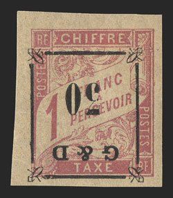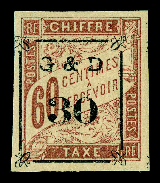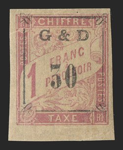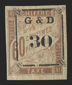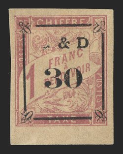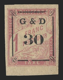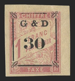 614 og Yvert #TT14d ImageYvert #TT14d, 1903 "G & D/30" Ty. a surcharge on 1Fr. Rose on cream, omitted "G", bottom sheet-margin single, with large margins on the other sides, o.g., h.r., extremely fine and rare; only 23 such errors were printed (Scott #J14 var.). (Image) €770
