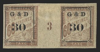 603 og Yvert #TT13 ImageYvert #TT13, 1903 "G & D/30" Ty. a surcharge on 60c Brown on cream, horizontal gutter pair with millesimes "3", generous margins all around, uncommonly fresh, o.g., l.h., very fine and rare; only 33 millesimes pairs are possible (Scott #J13 var.). (Image) Maury €2,750