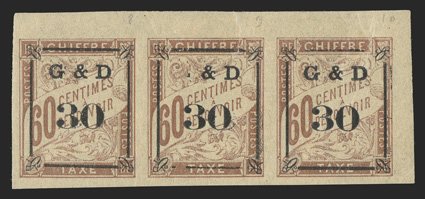 604 og Yvert #TT13, 13d ImageYvert #TT13, 13d, 1903 "G & D/30" Ty. a surcharge on 60c Brown on cream, omitted "G" , top right corner margin horizontal strip of three, with large margins on the other two sides, the center stamp the variety, strong color on fresh paper, o.g., h.r., the left stamp n.h., extremely fine; only 33 examples were printed; each signed A. Brun and Calves (Scott #J13, J13d; $1,450.00 for hinged singles). (Image) for singles €1,400+