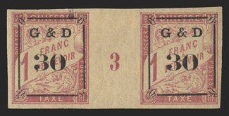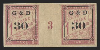 608 og Yvert #TT14 ImageYvert #TT14, 1903 "G & D/30" Ty. a surcharge on 1Fr. Rose on cream, horizontal gutter pair with millesimes "3", mostly large margins all around, strong color on fresh paper, o.g., h.r., very fine and rare; only 23 millesimes pairs are possible (Scott #J14 var.). (Image) Maury €3,500