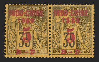 615 og Yvert #1, 1a ImageYvert #1, 1a, 1889 "INDO-CHINE/1889/5/R-D" Red surcharge on 35c Deep violet on orange, large and small "1889", without gum as issued, se-tenant horizontal pair, crisp and intact, very fine and scarce (Scott #2, 2a; $300.00 for singles). (Image) €600