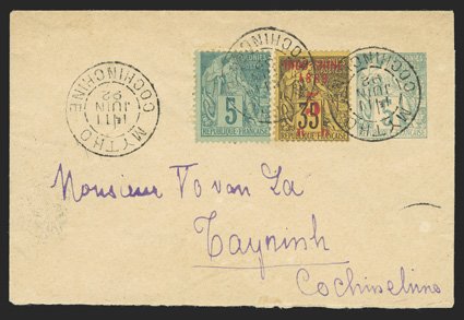 616 c   ImageFrench Colonies 5c entire to Tayninh, Cochin China uprated with French Colonies 5c Green (Yvert #49) and Indochina 1889 red 5c surcharge on 35c Deep violet on orange (Yvert #1), tied by two strikes of "Mytho, Cochinchine/11 Juin, 92" datestamps, postmark repeated at left, Saigon and Tayninh backstamps, fresh and extremely fine; scarce mixed franking and a rare usage of the first Indochina issue (Scott #2; $1,200.00). (Image) Est. $150-200