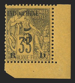 617 og Yvert #2a ImageYvert #2a, 1889 "INDO-CHINE 89/5/R D" Black surcharge on 35c Deep violet on orange, "89" omitted, bottom right corner margin mint single, remarkably fresh, o.g., l.h., very fine; signed Miro (Scott #1 var.). (Image) €310