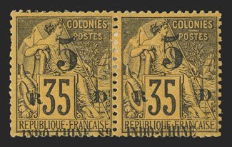 618 og Yvert #2a ImageYvert #2a, 1889 "INDO-CHINE 89/5/R D" Black surcharge on 35c Deep violet on orange, "89" omitted, se-tenant horizontal pair, the right stamp the error, plus it shows a strong upward shift of the overprint, with "INDO-CHINE" at bottom, o.g., h.r., fresh and very fine (Scott #1 var.). (Image) €440