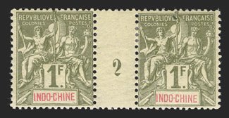 620 og Yvert #3-15 ImageYvert #3-15, 1892-96 1c-1Fr. Peace and Commerce, nearly complete millesimes gutter pairs comprised of 1c #1 (in a block of four), 2, 3 and 9, 2c 2 and 3, 4c 2 and 3, 5c 2 (in a block of four), 5 and 8, 10c 2 and 3, 15c 5, 20c 2 and 3, 25c 2 and 5, 30c 2 and 3, 40c 2 (in a block of four) and 3, 50c 2 and 3, 75c 2 and 3 and 1Fr. 2 and 3, generally fresh and intact, o.g., l.h. or h.r., a few n.h., occasional perforation separations, mostly fine-very fine; a difficult group to assemble (Scott #3/20 vars.). (Image) Maury €4,310
