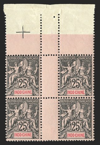 621 og/nhbl Yvert #10 ImageYvert #10, 1892 25c Black on rose, top sheet-margin block of four with vertical gutter without millesimes, fresh and intact, o.g., h.r. at bottom, the top pair n.h., fine-very fine (Scott #13 var.). (Image) Maury €570+