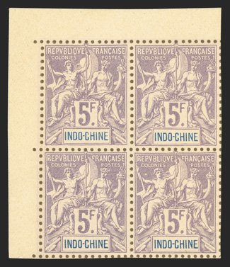 622 Pbl Yvert #12-16P ImageYvert #12-16P, 1892-1900 40c-5Fr. Peace and Commerce, plate proofs on Bristol, top left corner margin blocks of four, except 1Fr. top right corner margin, fresh and extremely fine; 5Fr. signed Roumet (Scott #16-17, 19-21P). (Image) Est. $400-500