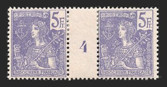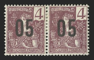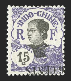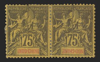 623 og Yvert #14a ImageYvert #14a, 1892 75c Deep violet on orange, inverted "INDO-CHINE", se-tenant horizontal pair, the right stamp the error, strong fresh colors, o.g., with h.r.'s reinforcing some separated perfs., very fine; a striking example of this rare and popular error, being especially desirable in this se-tenant format; signed Marquelet and accompanied by a 2001 Calves certificate (Scott #19a; $7,223.00). (Image) €9,526