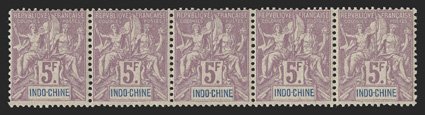 625 nh Yvert #16 ImageYvert #16, 1896 5Fr. Red lilac on lavender, horizontal strip of five, remarkably fresh, unblemished o.g., n.h., very fine; seldom found never hinged (Scott #21; $1,250.00). (Image) Maury €1,500