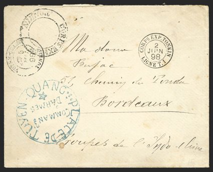 626 c   ImagePlace de Tuyen-Quang/CommanT/D'Armes, large blue military cachet and dateless double circle "Corps Exped Tonkin" postmark on cover to Bordeaux, "Tuyen Quang/5 Mai, 98" and bold "Corps Exp Tonking/Ligne T. 1/2 Juin, 98" transit postmarks, Tonking departure and Bordeaux arrival backstamps, very fine and scarce soldier's letter. (Image) Est. $300-400