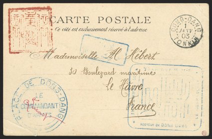 627 c   ImagePlace de Dong-Dang/Le/Commandant/D'Armes, large blue military cachet signed by an officer and three other military chops on picture post card to Le Havre, "Dong-Dang, Tonkin/1 Janv, 03" datestamp, card with tape repaired corner crease at bottom left, otherwise very fine and rare. (Image) Est. $400-500