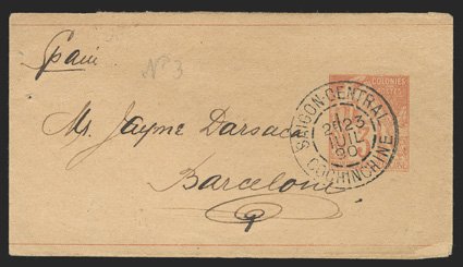 628 c   ImageFrench Colonies 3c Red wrapper to Spain, used with clear "Saigon Central, Cochinchine/23 Juil, 90" datestamp, mounting adhesion on reverse, very fine; a very scarce foreign rate. (Image) Est. $100-150