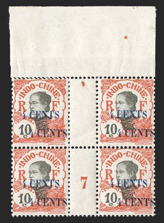 635 nhbl Yvert #76c ImageYvert #76c, 1919 "4 CENTS" Surcharge on 10c Red and black, double surcharge, top gutter margin gutter block of four, bottom pair with millesimes "7", bright and fresh, o.g., n.h., some crimped or separated perforations, otherwise fine; this error is not listed in Maury as a millesimes pair so cataloged only as four singles (Scott #69b; $800.00 for singles). (Image) Maury €1,000+