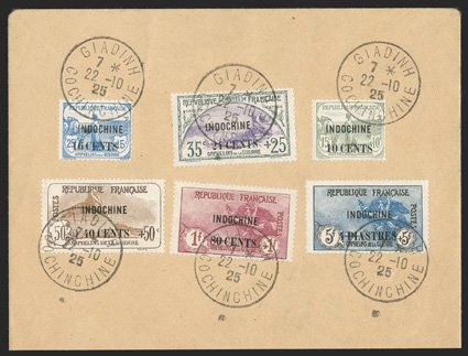 638 c Yvert #90-95 ImageYvert #90-95, 1919 "10 CENTS" on 15c+10c to "4 PIASTRES" on 5Fr.+5Fr. Orphans, complete set tied by clear "Giadinh, Cochinchine/22-10, 25" datestamps to fresh unaddressed cover, extremely fine (Scott #B8-13; $272.10 for used). (Image) for used €326