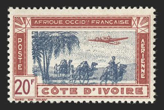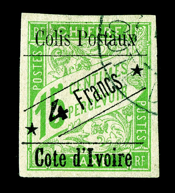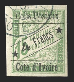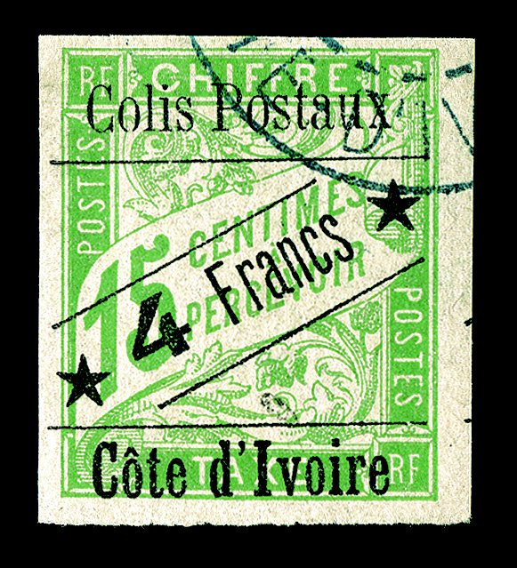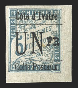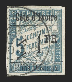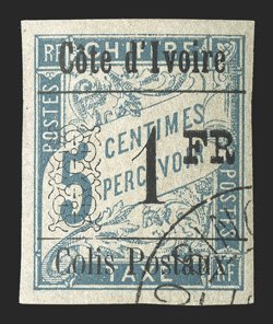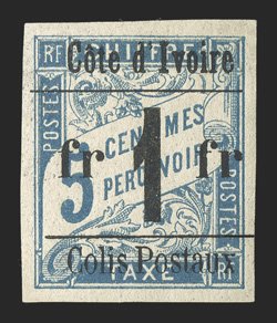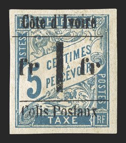670 O Yvert #CP7d ImageYvert #CP7d, 1903 "Cote d'Ivoire/XX 1 FR/Colis Postaux" Ty. V Surcharge on 5c Blue postage due, a very elusive used example of this parcel post rarity, four large even margins, rich color on fresh white paper, neatly cancelled by 29 June 1903 postmark, choice very fine; signed Pavoille (Scott #Q9; $3,250.00). (Image) €4,500