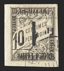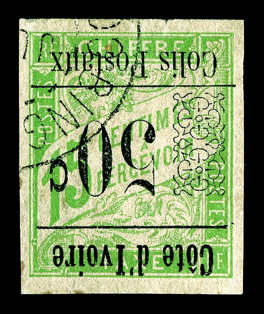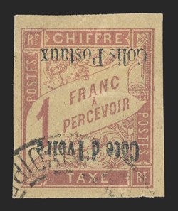 663 O Yvert #CP4a ImageYvert #CP4a, 1903 "Cote d'Ivoire/Colis Postaux" Overprint on 1Fr. Rose on buff postage due, inverted overprint, used with neat c.d.s. confined to the bottom, four large margins, extremely fine (Scott #Q6a; $350.00). (Image) €400