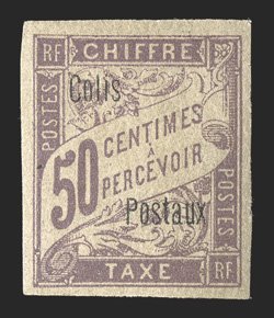 664 og Yvert #CP4A ImageYvert #CP4A, 1903 "Colis/Postaux" Overprint on 50c Lilac postage due, a desirable mint example of this rare stamp, generous margin all around, remarkably fresh, o.g., trivial h.r., very fine; a mere 75 stamps were overprinted; signed Calves and accompanied by 1996 Roumet certificate (Scott #Q3; $3,100.00). (Image) €4,250
