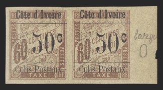 667 og Yvert #CP6, 6a ImageYvert #CP6, 6a, 1903 "Cote d'Ivoire/50c/Colis Postaux" Surcharge on 60c Brown on buff postage due, large "0" in "50", right sheet-margin horizontal pair, the right stamp the variety, large even margins all around, wonderfully fresh, o.g., minor h.r., extremely fine; both signed Calves (Scott #Q8, Q8 var.). (Image) for singles €405