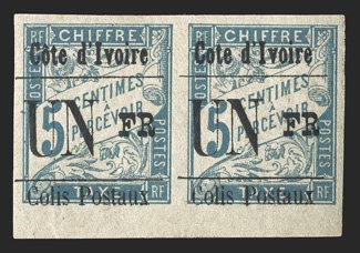 672 og Yvert #CP7g, 7w ImageYvert #CP7g, 7w, 1903 "Cote d'Ivoire/UN FR/Colis Postaux" Ty. VII Surcharge on 5c Blue postage due, without accent on "o" of "Cote", bottom sheet-margin horizontal pair, with large even margins on the other sides, the right stamp the variety, incredibly fresh, o.g., barest trace of hinging, extremely fine; both signed Calves (Scott #Q15, Q15 var.; $200.00 for normal). (Image) €375