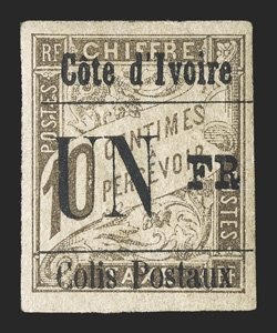 674 og Yvert #CP8b ImageYvert #CP8b, 1903 "Cote d'Ivoire/UN FR/Colis Postaux" Ty. VIII Surcharge on 10c Grey brown postage due, an attractive mint example of this very rare parcel post surcharge, large to very large margins all around, good color, o.g., h.r., very fine; a mere twenty stamps received the Ty. VIII surcharge; signed A. Brun, Gilbert and Roumet and accompanied by 2000 Roumet certificate (Scott #Q19; $3,700.00). (Image) €5,000