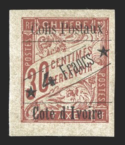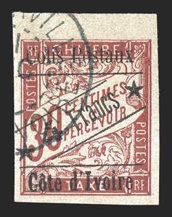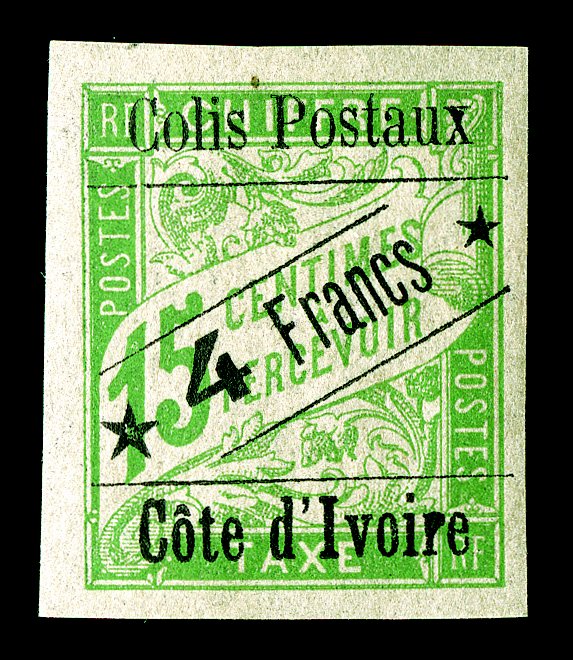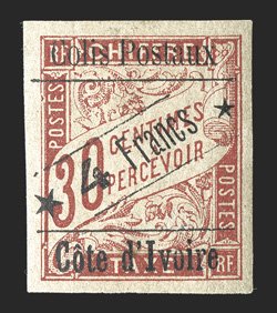 678 og Yvert #CP10d ImageYvert #CP10d, 1903 "Colis Postaux/* 4 Francs */Cote d'Ivoire" Surcharge with two large stars on 30c Rose postage due, without accent over "o" of "Cote", choice mint example, four mostly oversized margins, fresh color on clean paper, o.g., extremely fine (Scott #Q25b var.; $300.00 for normal). (Image) €530