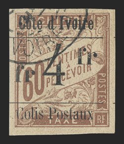 679 O Yvert #CP11a ImageYvert #CP11a, 1903 "Cote d'Ivoire/fr 4 fr/Colis Postaux" Ty. III Surcharge on 60c Brown on buff postage due, large even margins all around, lightly cancelled, fresh and very fine; only 216 stamps received the Ty. III surcharge (Scott #Q22; $325.00). (Image) €510