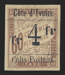 680 og Yvert #CP11b ImageYvert #CP11b, 1903 "Cote d'Ivoire/fr 4 fr/Colis Postaux" Ty. IV Surcharge on 60c Brown on buff postage due, attractive mint example of this rare stamp, generous equal margins, o.g., very fine; only 72 stamps received the Ty. IV surcharge; signed Cividini (Scott #Q23; $1,200.00). (Image) €1,300