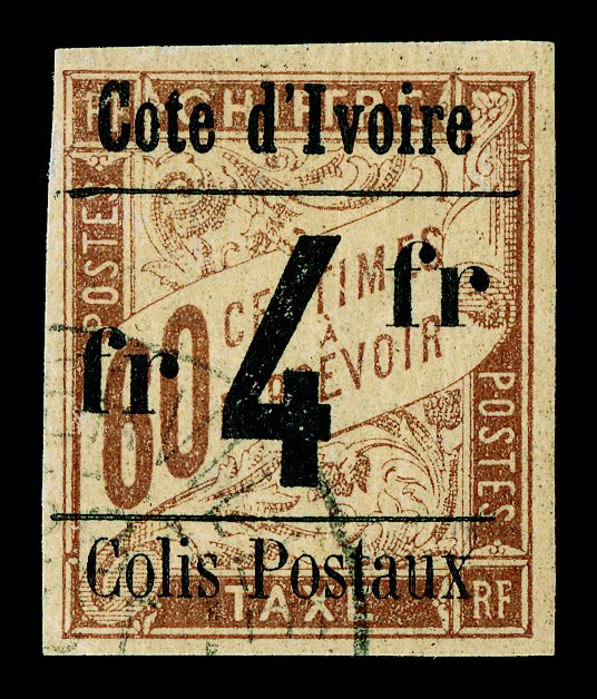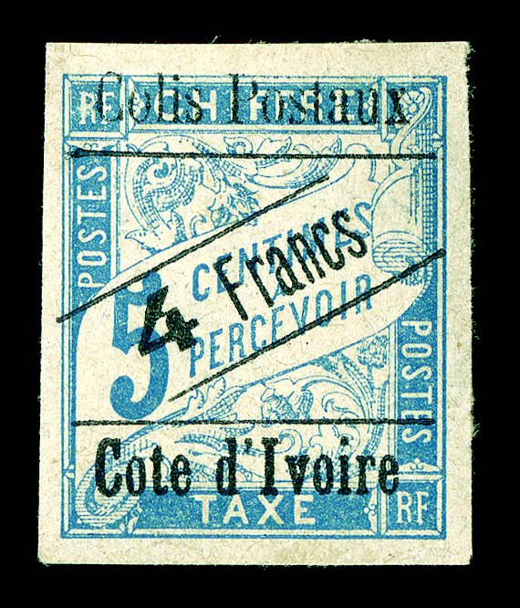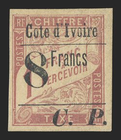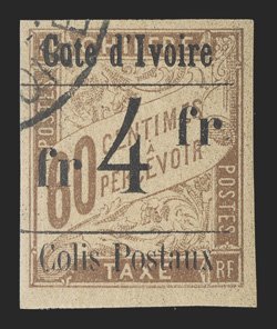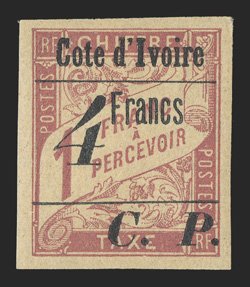 685 og Yvert #CP21a ImageYvert #CP21a, 1903 "Cote d'Ivoire/4 Francs/C. P." Ty. II Surcharge on 1Fr. Rose on buff postage due, a handsome mint example of this very rare stamp, large margins all around, strong color on fresh paper, o.g., h.r., very fine and choice; a mere 40 stamps received the surcharge with the slanting "4" (Scott #Q35a; $2,200.00). (Image) €2,400