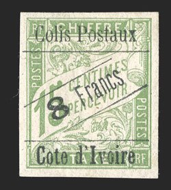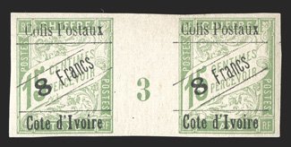 683 og Yvert #CP17 ImageYvert #CP17, 1903 "Colis Postaux/8 Francs/Cote d'Ivoire" Surcharge on 15c Pale green postage due, horizontal gutter pair with millesimes "3", ample to large margins all around, very fresh, o.g., l.h., very fine; only 20 millesimes pairs are possible (Scott #Q31; $480.00 for singles). (Image) Maury €750
