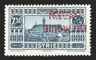 686 nh Yvert #14a ImageYvert #14a, 1931 7.50pi Blue, inverted overprint, rich color, o.g., n.h., fine; only one sheet was printed with the inverted overprint (Scott #17a; $650.00). (Image) for hinged €750