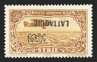 688 nh Yvert #PA1a ImageYvert #PA1a, 1931 50c Yellow brown air post, inverted overprint, well centered, rich bright color, o.g., n.h., very fine; a rare error, with only one sheet printed (Scott #C1a; for hinged $1,200.00). (Image) for hinged €1,300